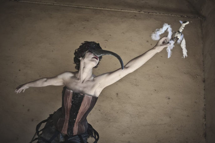The protagonist is therefore a Chimera in her multiple forms, first a woman with a bird’s head, then a bird with a woman’s head, followed by (still in creation) a post-modern interpretation of the figure of the Mermaid, a woman with a fish tail which transforms in a woman with a fish head and a woman´s legs wearing flaming red stiletto heels. In the end Circe, the pig-woman, roasted and